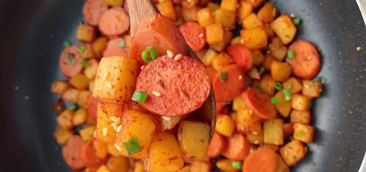 1、將土豆和火腿切成塊。2、鍋中倒入適量的清水,同時(shí),倒入土豆塊,大火煮開(kāi)后,快速2-3分鐘后撈出,這個(gè)環(huán)節(jié)是將它們里頭多余的淀粉煮出來(lái),焯水的目的是:讓它們的口感變得更加的適口,再經(jīng)過(guò)油煎或者油炸后,不僅酥脆感會(huì)倍增,而且更容易吸附上香料的味道。3、起鍋燒油,油熱后,先將焯好的土豆丁倒入鍋中,將它們煎至表面焦黃酥脆,并且散發(fā)出清甜的香味后,再放入事先準(zhǔn)備好的火腿腸,大火快速顛炒均勻后,再加入少許的鹽、雞精調(diào)味。4、然后,再在鍋中放入適量的辣椒粉和孜然粒(前者建議多放,后者少放,它們是這道街邊小吃味道的靈魂),同時(shí),倒入1勺的生抽(起到提鮮的效果),大火快速顛炒均勻后,再撒入適量的蔥花裝飾點(diǎn)綴一下,即可裝盤(pán)上桌。